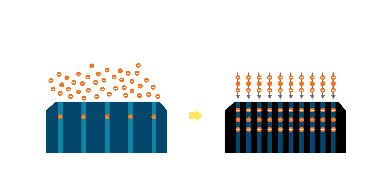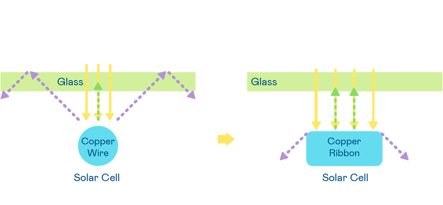 - 电池使用多条铜导线 (Copper wire) 于电池片上形成较短的电流路径,提高电流收集效率,采用圆形设计的铜导线较传统扁平式的铜焊带 (Ribbon),可增加入射至电池的光线量。